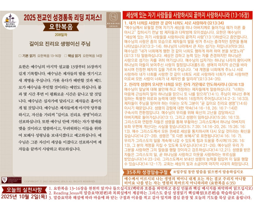할렐루야! 2025년 전교인성경통독 리딩 지저스 제208일차 말씀은 요한복음 13-16장입니다.