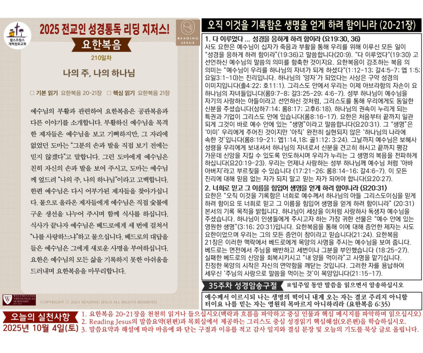 할렐루야! 2025년 전교인성경통독 리딩 지저스 제210일차 말씀은 요한복음 20-21장입니다.