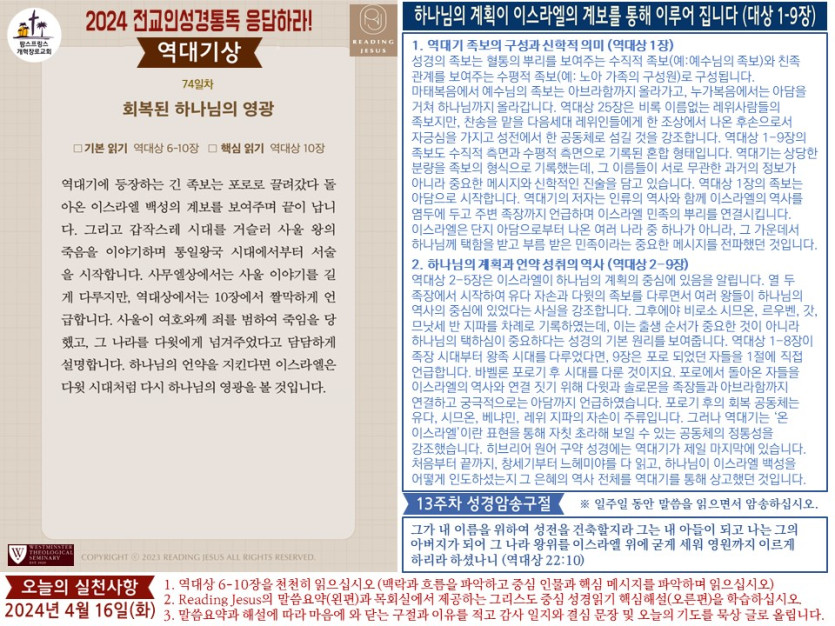 (2024년 4월 16일) 'Reading Jesus 응답하라' 말씀요약과 본문해설 (제74일차)