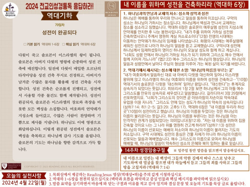 (2024년 4월 22일) 'Reading Jesus 응답하라' 말씀요약과 본문해설 (제79일차) 입니다.