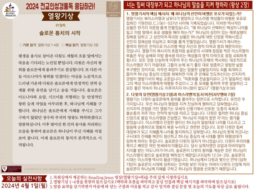(2024년 4월 1일) 'Reading Jesus 응답하라' 말씀요약과 본문해설 (제61일차) 입니다.