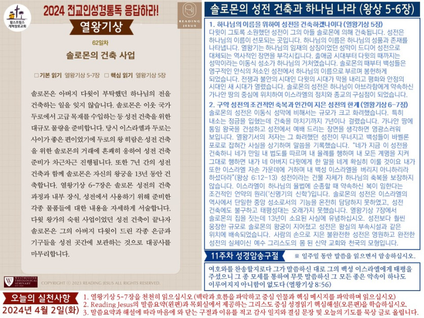 (2024년 4월 2일) 'Reading Jesus 응답하라' 말씀요약과 본문해설 (제62일차)입니다.