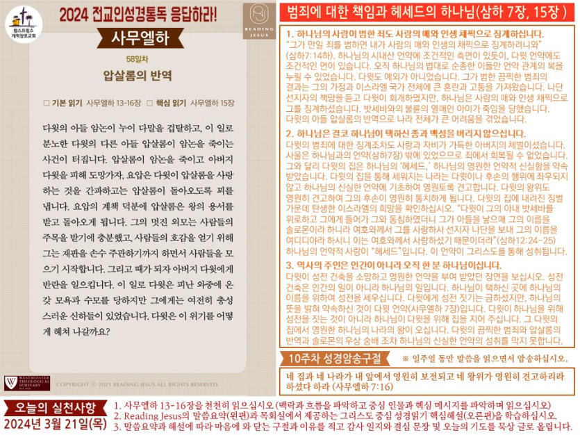(2024년 3월 21일) 'Reading Jesus 응답하라' 말씀요약과 본문해설 (제58일차) 입니다.