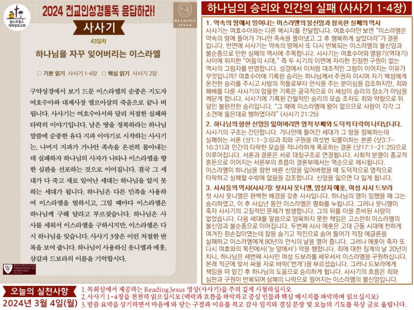 (2024년 3월 4일) 'Reading Jesus 응답하라' 말씀요약과 본문해설 (제43일차) 입니다.