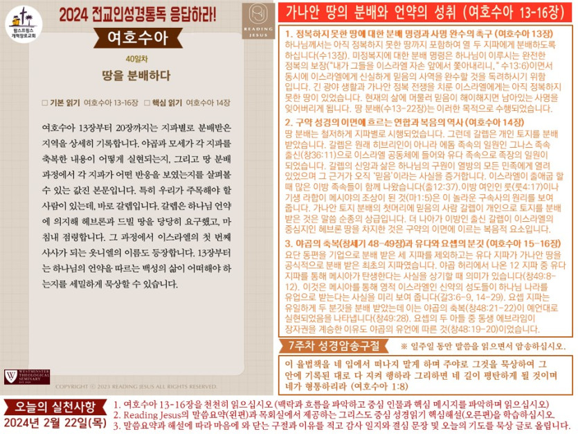 - 이전글(2024년 2월 23일) 'Reading Jesus 응답하라' 말씀요약과 본문해설 (제41일차) 24.02.24