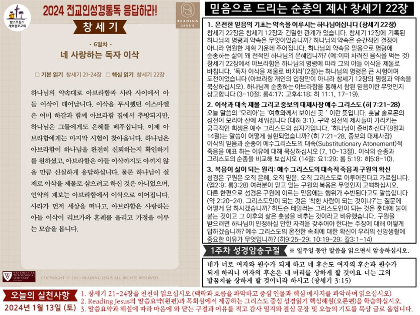 (5) 우리가 2024년에 시작한 전교인 성경통독 Reading Jesus 응답하라 2024는 성경 읽기와 말씀 묵상과 신앙 고백과 삶의 예배가 어우러진 새벽 제단입니다. 하나님의 선하심을 의심하지 않고 하나님의 약속을 끝까지 붙잡는 사람은 그 아름다운 약속의 땅에 이 땅에서도 믿음으로 누리고 또한 마침내 주님과 함께 그 나라에 입성할 것입니다. 성경이 말씀하는 “하나님의 약속”은 예수 그리스도입니다.
