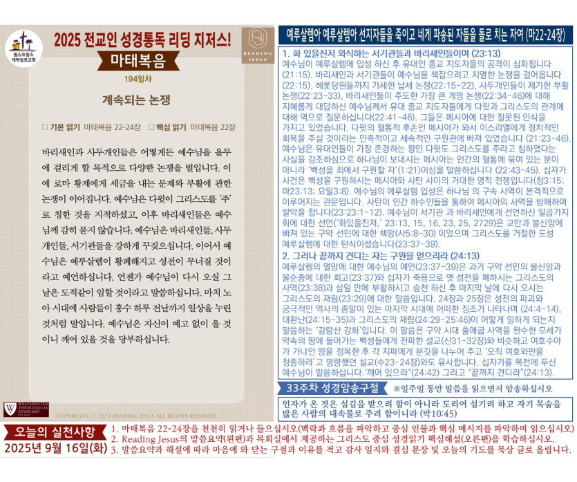 할렐루야! 2025년 전교인성경통독 리딩 지저스 제194일차 말씀은 마태복음 22-24장입니다.