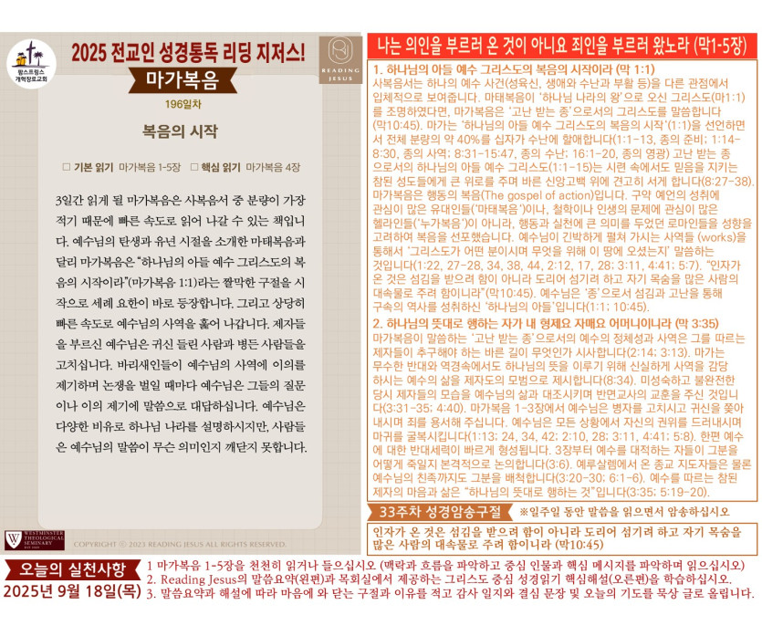 할렐루야! 2025년 전교인성경통독 리딩 지저스 제196일차 말씀은 마가복음 1-5장입니다.
