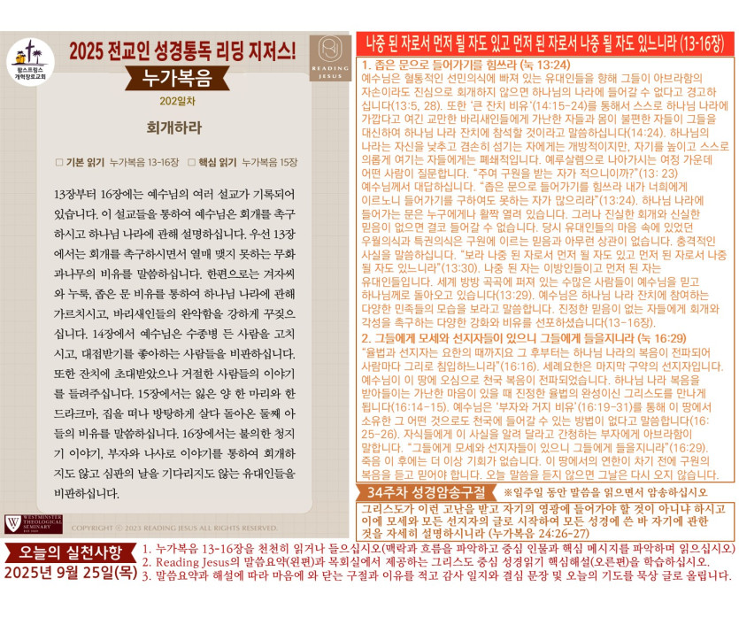 할렐루야! 2025년 전교인성경통독 리딩 지저스 제202일차 말씀은 누가복음 13-16장입니다.