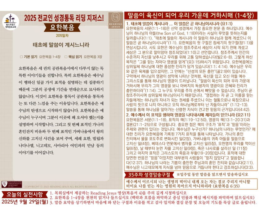 할렐루야! 2025년 전교인성경통독 리딩 지저스 제205일차 말씀은 요한복음 1-4장입니다.