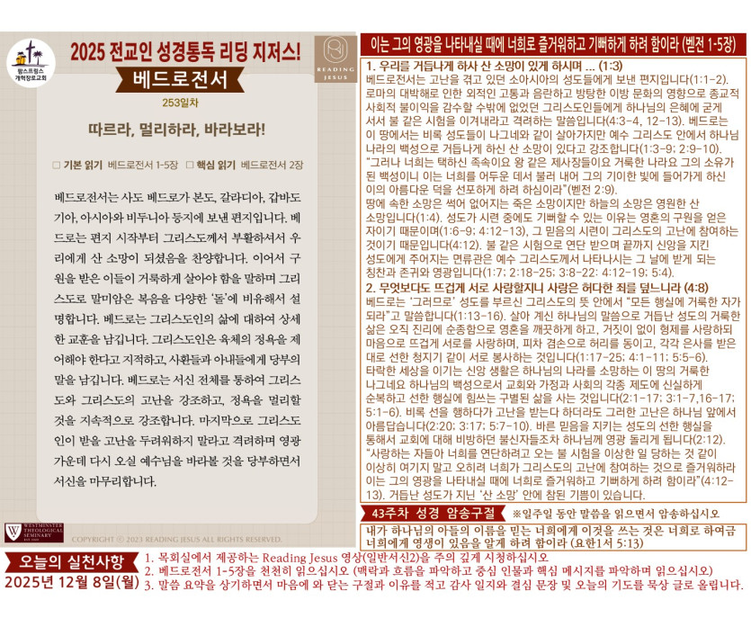 할렐루야! 2025년 전교인성경통독 리딩 지저스 제253일차 말씀은 베드로전서 1-5장입니다.