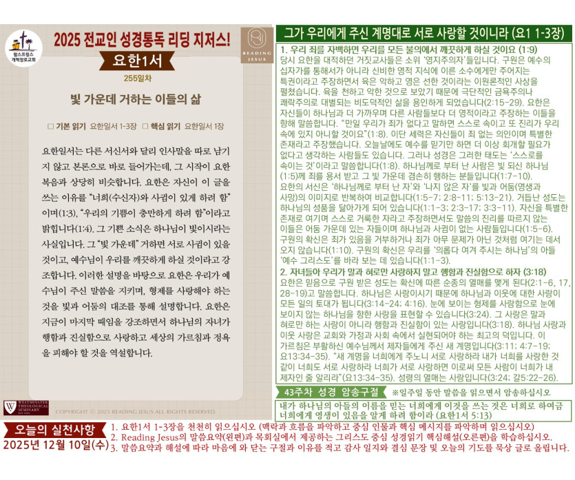 할렐루야! 2025년 전교인성경통독 리딩 지저스 제255일차 말씀은 요일 1-3장입니다.