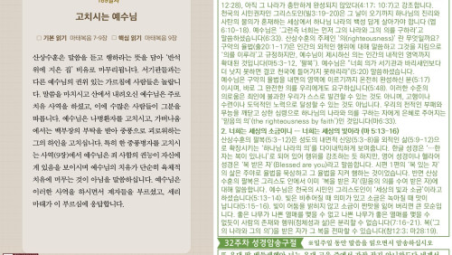 할렐루야! 2025년 전교인성경통독 리딩 지저스 제188일차 말씀은 마태복음 4-6장입니다. 예수님이 탄생하신 장소는 그의 정체성과 공적 사역에 중대한 의미를 부여합니다. 구약 성경의 예언과 예수님의 공생애가 정확하게 일치한다는 사실을 뒷받침하는 출발점이기 때문입니다(마2:1-6; 렘31:15). 베들레헴은 예수님의 조상 보아스가 룻과 결혼한 땅(룻4:11-12)이었고, 예수님의 선조 다윗의 고향(삼상16:18; 눅2: 4)이었으며, 이스라엘의 왕이 탄생한다고 예언된 곳(마5:2)입니다. 예수님의 어린 시절 고향인 갈릴리 나사렛도 구약 예언의 성취입니다(사9:1-2). 그는 나사렛 예수로 불리셨고(마2:23) 그의 첫 사역지도 갈릴리 땅입니다(4:2-25). 복음서는 예수님의 사역의 종착지를 심판 받을 성읍 예루살렘(마11:1-11; 눅19:28-44)으 로 규정합니다. 예루살렘에서 아주 가까운 베다니에서 세례를 받으신 후(마3:13; 요1:28), 공적인 사역을 시작하기 위해 북쪽의 갈릴리로 가셔서, ‘이 때부터 천국이 가까이 왔느니라’ 선포하셨습니다(사9:15-16; 마4:17). 예수님을 통해 이 땅에 임하는 하나님의 나라는 백성이 기대했던 것과는 전혀 다른 방식이었습니다. 사복음서가 공통적으로 강조하는 ‘예루살렘’은 배척당하고, 고소당하고, 참혹하게 십자가에서 죽임을 당하는 ‘예수님의 모습’입니다. 당시 유대인들이 환호하고 기대하는 예루살렘이 아니라 이방의 갈릴리에 임하는 ‘구원의 빛’(마4:16) 으로 그리스도께서 오셨습니다. 하나님의 나라는 지형적 위치와 혈통적 한계를 뛰어 넘는 영적인 이스라엘입니다(사9:1; 42:6; 49:6; 마 4:15). 예수님은 갈릴리에서 예루살렘으로 전진하시면서 하나님의 뜻을 모두 이루셨습니다(마23:37; 26:39).