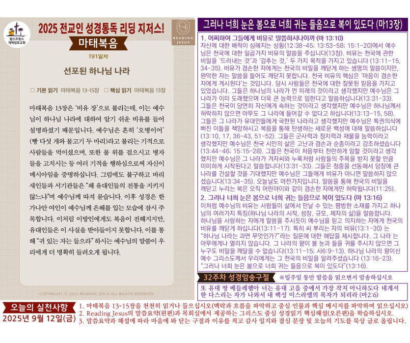 할렐루야! 2025년 전교인성경통독 리딩 지저스 제191일차 말씀은 마태복음 13-15장입니다.