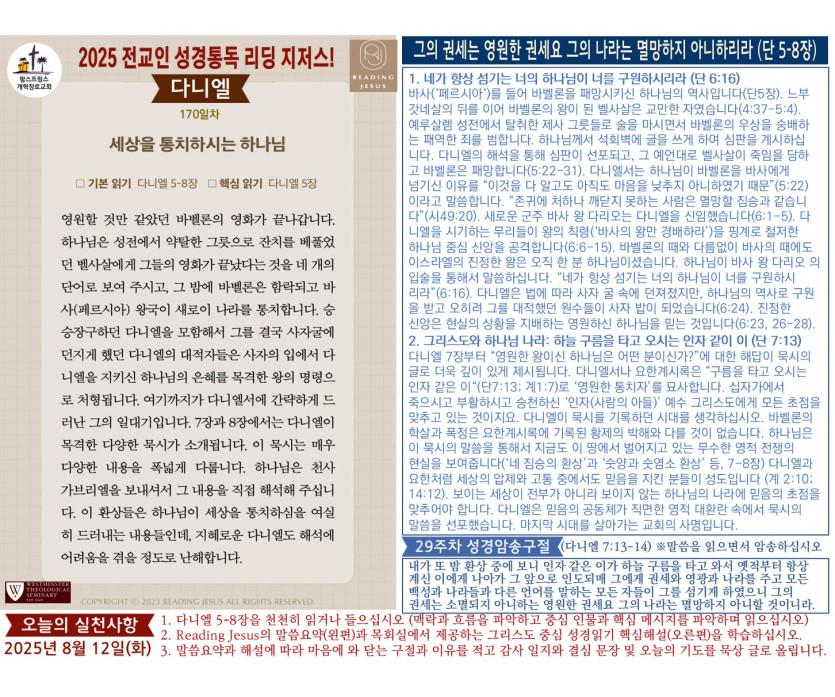 할렐루야! 2025년 전교인성경통독 리딩 지저스 제170일차 말씀은 다니엘 5-8장입니다.