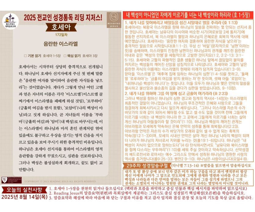 할렐루야! 2025년 전교인성경통독 리딩 지저스 제172일차 말씀은 호세아 1-5장입니다.