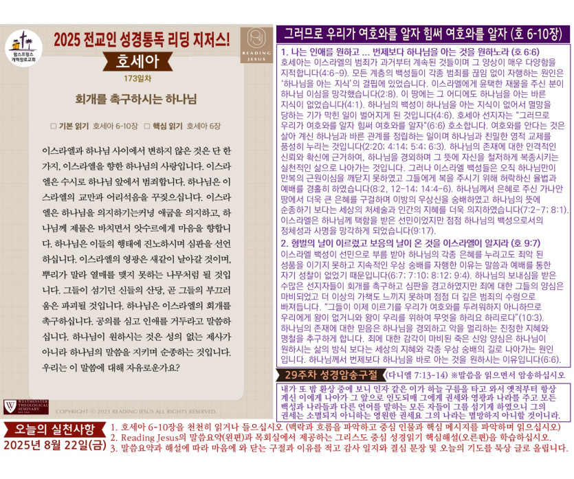 할렐루야! 2025년 전교인성경통독 리딩 지저스 제173일차 말씀은 호세아 6-10장입니다.