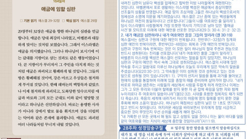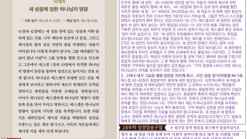할렐루야! 2025년 전교인성경통독 리딩 지저스 제167일차 말씀은 에스겔 41-44장입니다. 에스겔 40-48장은 새 성전의 환상을 통해 새 하늘과 새 땅의 새로운 질서를 보여줍니다(40:1-4). 이상 중에 본 새 성읍의 질서는 성전의 건축 양식을 표현하는 도면의 형태(‘새 성전,’ 40-43장)와 성전을 섬기는 자들의 의무와 제사에 관한 새로운 율법 제정의 형태(‘새 제사,’ 44-46장)와 생수의 강과 땅의 분배를 통한 지리적 형태(‘새 땅,’ 47-48장)로 계시되었습니다. 새 하늘과 새 땅에 대한 환상의 핵심은 여호와가 친히 오셔서 백성 가운데 다시 거하실 때, 그들은 반드시 스스로를 죄에서 정결하게 해야 한다는 것입니다(43:18-27). 에스겔서의 새 성전은 성전을 둘러 싼 담이 매우 높다는 것이 특징입니다(42:15-20) 안과 밖을 구분하는 담은 거룩한 성전과 성전 외부의 부정한 것 사이의 경계가 되는데, 에스겔의 환상 속에서 ‘담이 아주 높았다’는 것은 ‘새 성전이 부정함에서 완전히 차단되었다’는 특징을 강조합니다(42:20). 백성과 땅을 정결하게 하는 제사를 드리는 번제단(43:13-27)은 새 성전의 지리적인 중심부입니다. 새 성전의 번제단 위치는 광야 시대 장막과 옛 성전의 중심이 지성소 안의 언약궤였다는 점과 대조됩니다. 새 생전에서 제사장에게 주어진 규례들은 이 전에 모세에게 주신 율법과는 다르지만, 그 주제와 목적은 동일합니다. 백성이 마땅히 있어야 할 곳에 거하고 올바른 제사를 드림으로 정결케 되어야만 하나님이 그 분 백성과 함께 거하신다는 사실입니다(44:5-8). 저명한 구약학자 윌리엄 덤브렐이 강조했습니다. “구약 성경에 나타난 모든 제사는 하나님과의 관계를 유지하기 위한 것입니다.”
