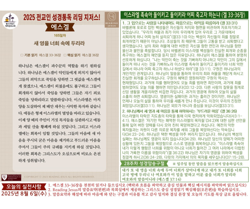할렐루야! 2025년 전교인성경통독 리딩 지저스 제165일차 말씀은 에스겔 33-36장입니다.