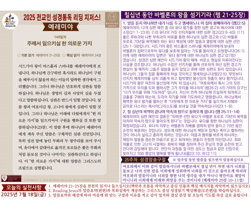 할렐루야! 2025년 전교인성경통독 리딩 지저스 제149일차 말씀은 예레미야 21~25장입니다.