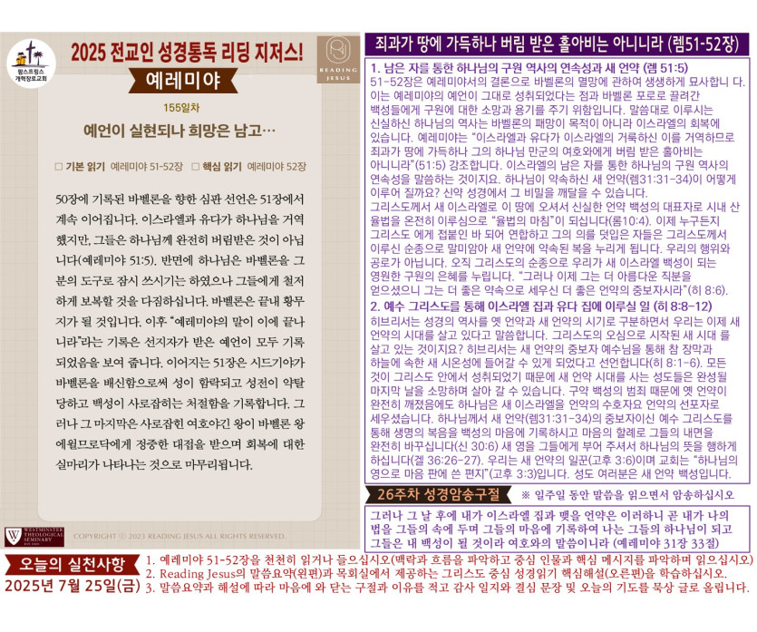 할렐루야! 2025년 전교인성경통독 리딩 지저스 제154일차 말씀은 예레미야 51-52장입니다.