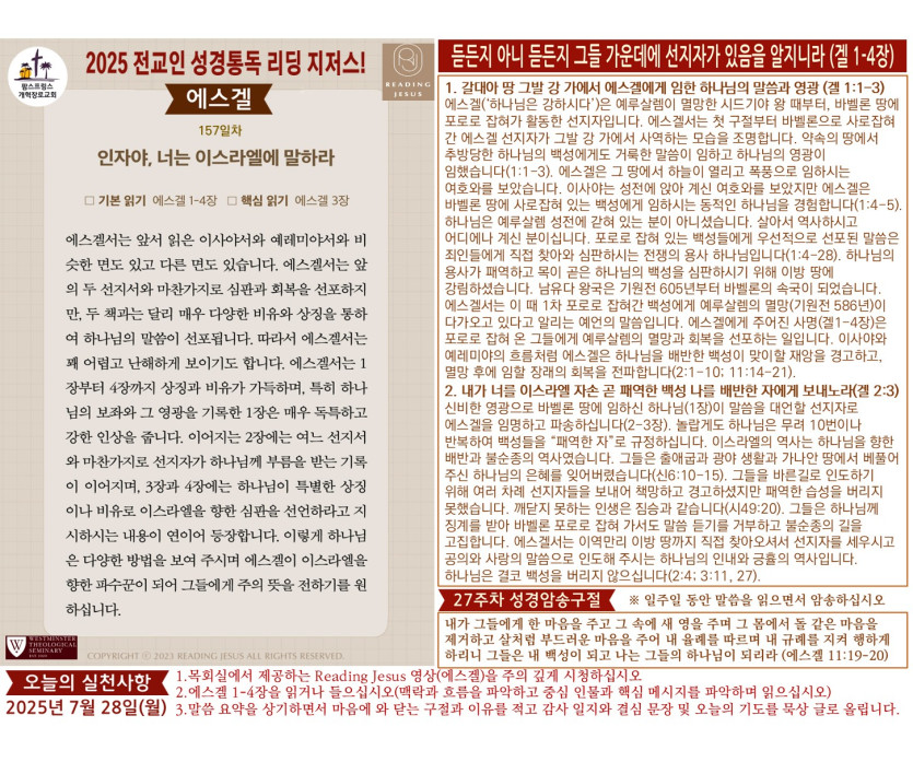 할렐루야! 2025년 전교인성경통독 리딩 지저스 제157일차 말씀은 에스겔 1-4장입니다.