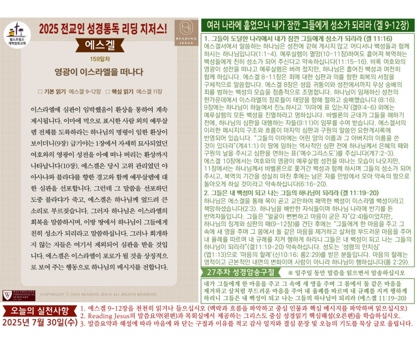 할렐루야! 2025년 전교인성경통독 리딩 지저스 제159일차 말씀은 에스겔 9-12장입니다.