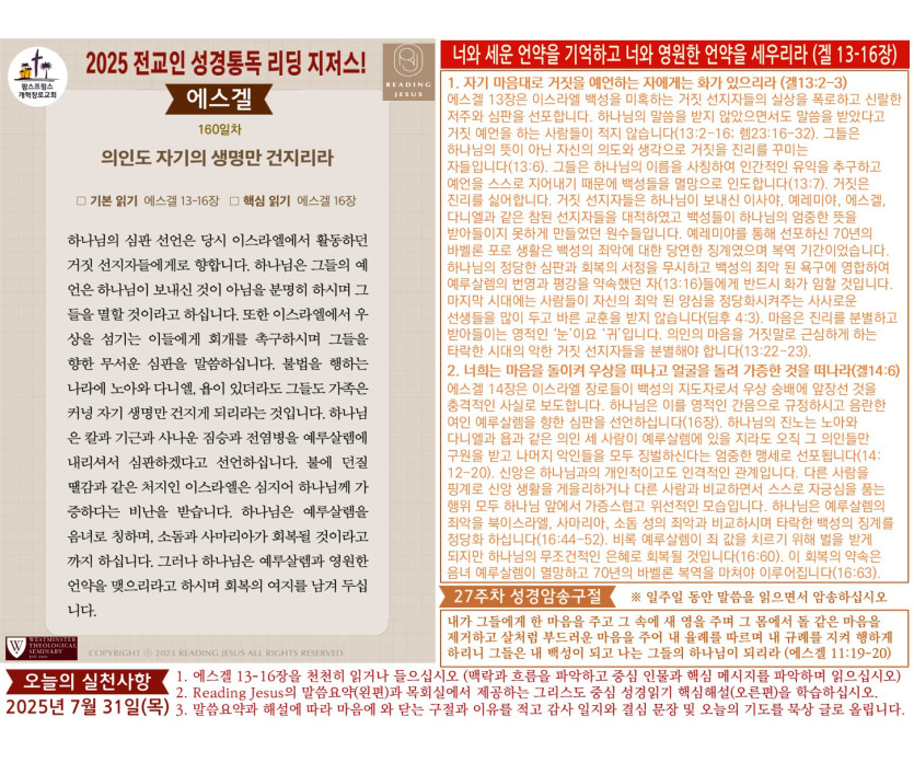 할렐루야! 2025년 전교인성경통독 리딩 지저스 제160일차 말씀은 에스겔 13-16장입니다.