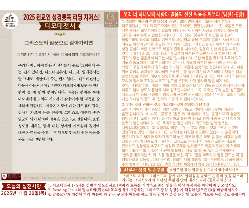 할렐루야! 2025년 전교인성경통독 리딩 지저스 제244일차 말씀은 딤전 1-6장입니다.