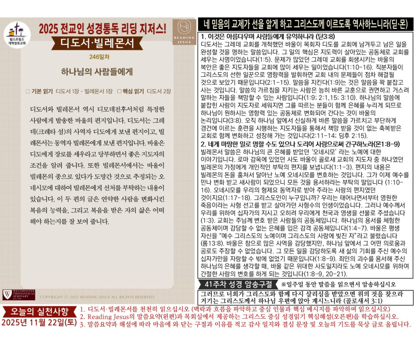 할렐루야! 2025년 전교인성경통독 리딩 지저스 제246일차 말씀은 디도서 1-3장 및 빌레몬서입니다.